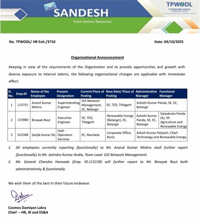 ଟିଟିଲାଗଡ,୦୪/୯(ଜେଏନଏସ), ଟିଟିଲାଗଡ ଟାଟା ପାୱାର କାର୍ଯ୍ୟନିର୍ବାହୀ ଯନ୍ତ୍ରୀ ବିନାୟକ ରାଉତ ଙ୍କ ବଲାଙ୍ଗୀର ଅକ୍ଷୟଶକ୍ତି ନିର୍ବାହୀ ଯନ୍ତ୍ରୀ ଭାବରେ ବଦଳି ହୋଇଛି।ଏନେଇ ବିଭାଗୀୟ ପତ୍ର ସଂଖ୍ୟା ୩୭୧୦/୦୪/୧୦/୨୫ ଅନ୍ତର୍ଗତ ବିଭାଗୀୟ ଆଦେଶ ଜାରି ହୋଇଛି।ଶ୍ରୀ ରାଉତ ଙ୍କ ସ୍ଥାନରେ ଆନନ୍ଦ କୁମାର ମିଶ୍ର ଙ୍କୁ ଟିଟିଲାଗଡ ଟାଟା ପାୱାର କାର୍ଯ୍ୟ ନିର୍ବାହୀ ଯନ୍ତ୍ରୀ ଭାବରେ ନିଯୁକ୍ତ କରାଯାଇଛି।ଶ୍ରୀ ରାଉତ ଟିଟିଲାଗଡ ଟାଟା ପାୱାର ରେ ପୂର୍ବରୁ ଏସଡିଓ ଏବଂ ପରେ ନିର୍ବାହୀ ଯନ୍ତ୍ରୀ ଭାବରେ ୩ ବର୍ଷ ସଫଳତାର ସହ ଦାୟିତ୍ଵ ନିର୍ବାହ କରିଛନ୍ତି।ତାଙ୍କ ସମୟରେ ଟାଟା ପାୱାର ବିଭାଗୀୟ ନିର୍ଦ୍ଧାରିତ ଲକ୍ଷ୍ୟ ପୁରଣ କରିବା ଦିଗରେ ଉଲ୍ଲେଖନୀୟ ସଫଳତା ହାସଲ କରିଥିବା ଦେଖିବାକୁ ମିଳିଛି।